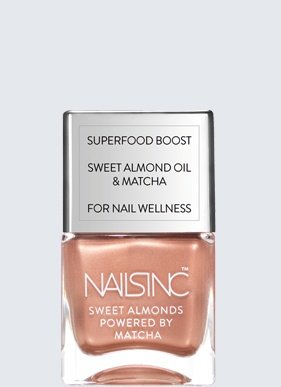 爪を保護するスーパーフード、スイート アーモンドオイルを配合した「NAILS INC スーパーフード ブースター」。#メイフェア マーケット ミューズはブロンズパールを配合し繊細な輝きを放つコッパーカラーです。