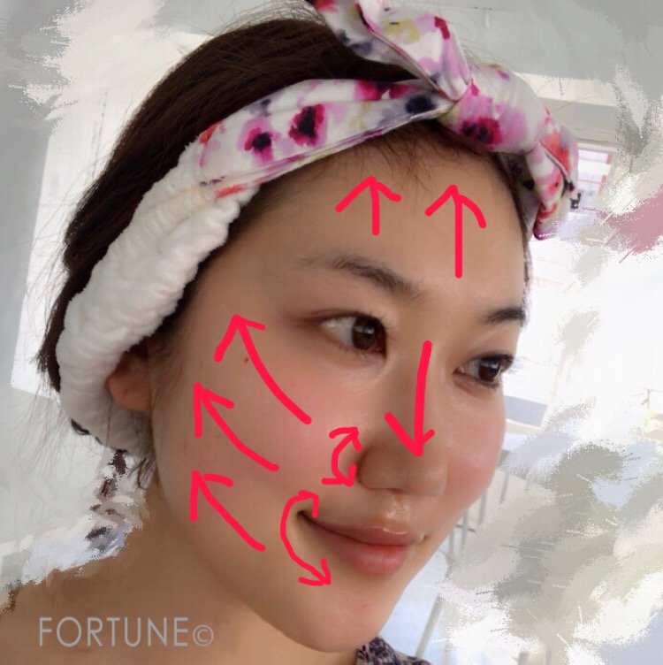 その後手のひらを密着させながら、あご先から上に向かって順番に優しく伸ばしていきます。最後に手のひらで顔を覆うようにして3秒くらい軽く押さえ、手のひらを上にずらしながら顔全体に浸透させていきます。2回くらい繰り返してしっかり浸透させていきます!