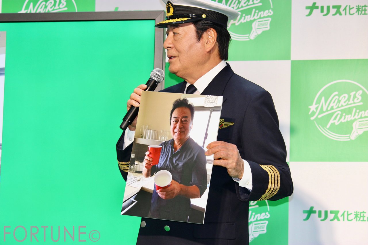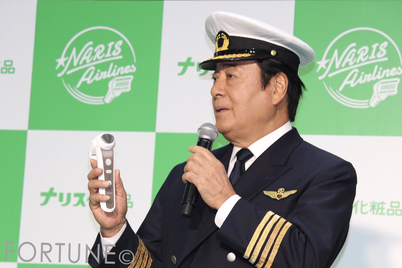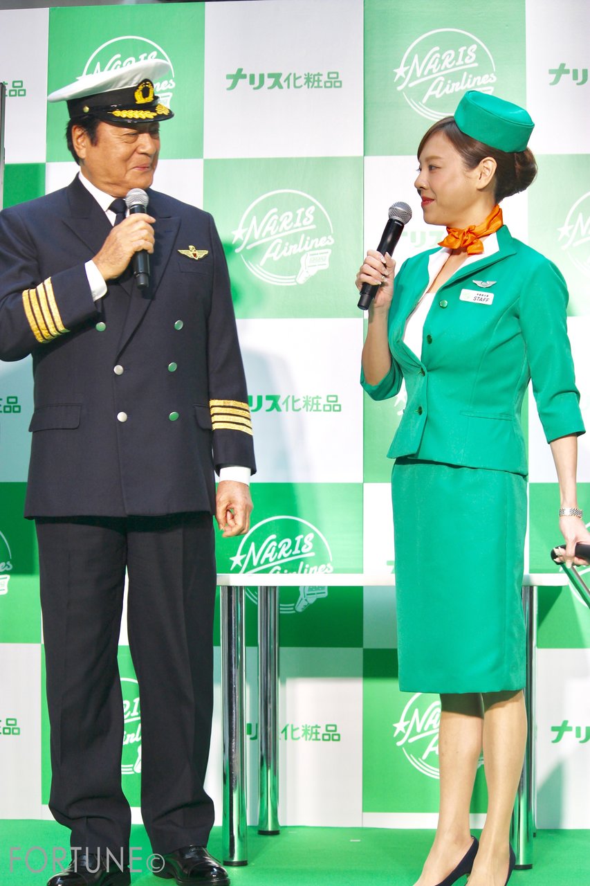 今回のイベントでは、「ナリス航空」というコンセプトの元、高橋英樹さん・高橋真麻さんが、それぞれパイロット・CAのコスチュームで登壇しました。