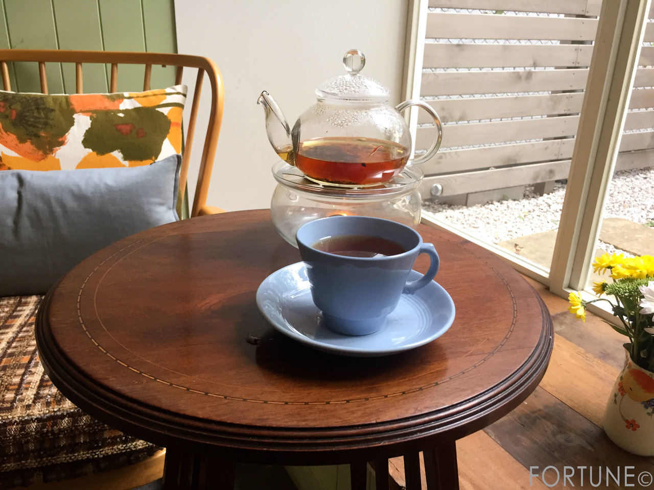温かみのあるキッチンやお花、フルーツ、アンティークのティーセット、古本などがディスプレイされています。