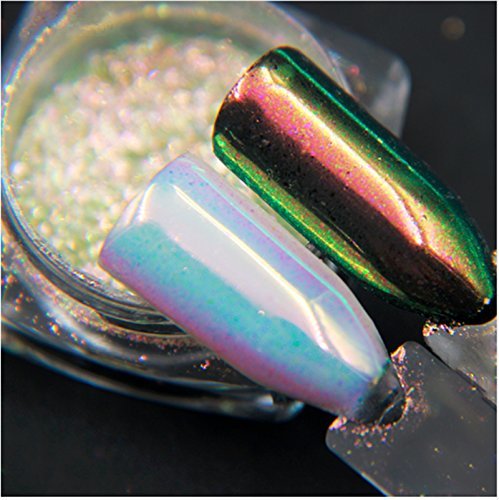 今までのクロムパウダーやオーロラパウダーと違うのは、光の入り方で不思議な虹色の輝きを放つ事!ベースのカラー次第で様々なカラーに輝きますよ♡メタリックな感じを残しつつ玉虫色のようにグラデーションがかって不思議なカラーになるのが面白いですね♪今年の夏ネイルのブームになること間違いなしです!