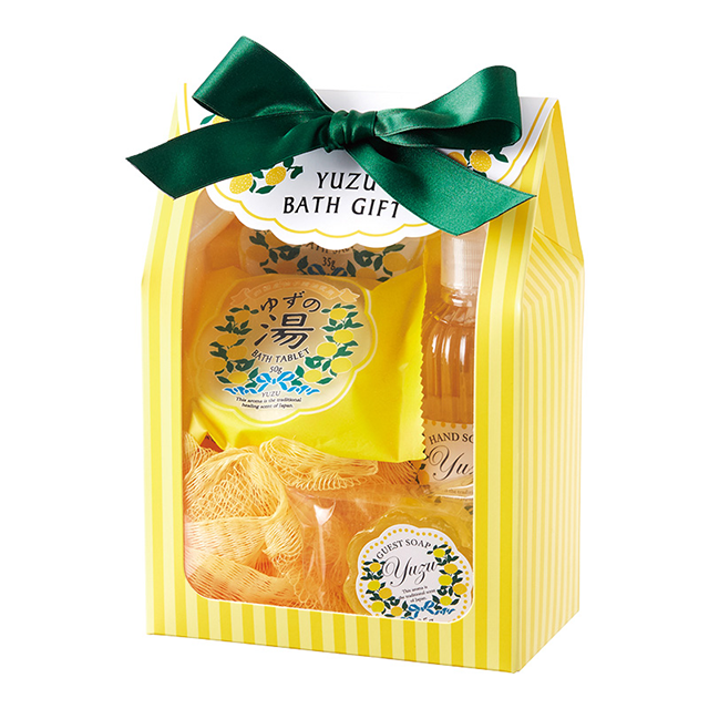 ゆずの香りを満喫できるバスグッズが一つに!『ゆず バスギフト』は、バスタブレット・ハンドソープ・バススポンジ・ゲストソープ・バスソルトがセットになったお得なセットです。ゲストソープ&バスソルトはギフト限定アイテムになります♪