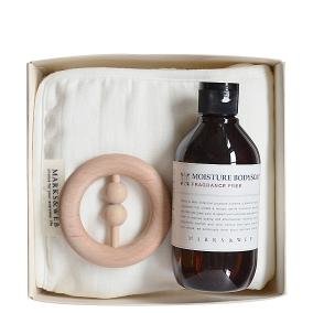 こちらのギフトセットは、モイスチャーボディーソープ、オーガニックコットンスリーピングタオル、ウッドベビーラトルリングの3点セット。ボディーソープは、マークスアンドウェブの中でも一番しっとりとした洗い心地です。