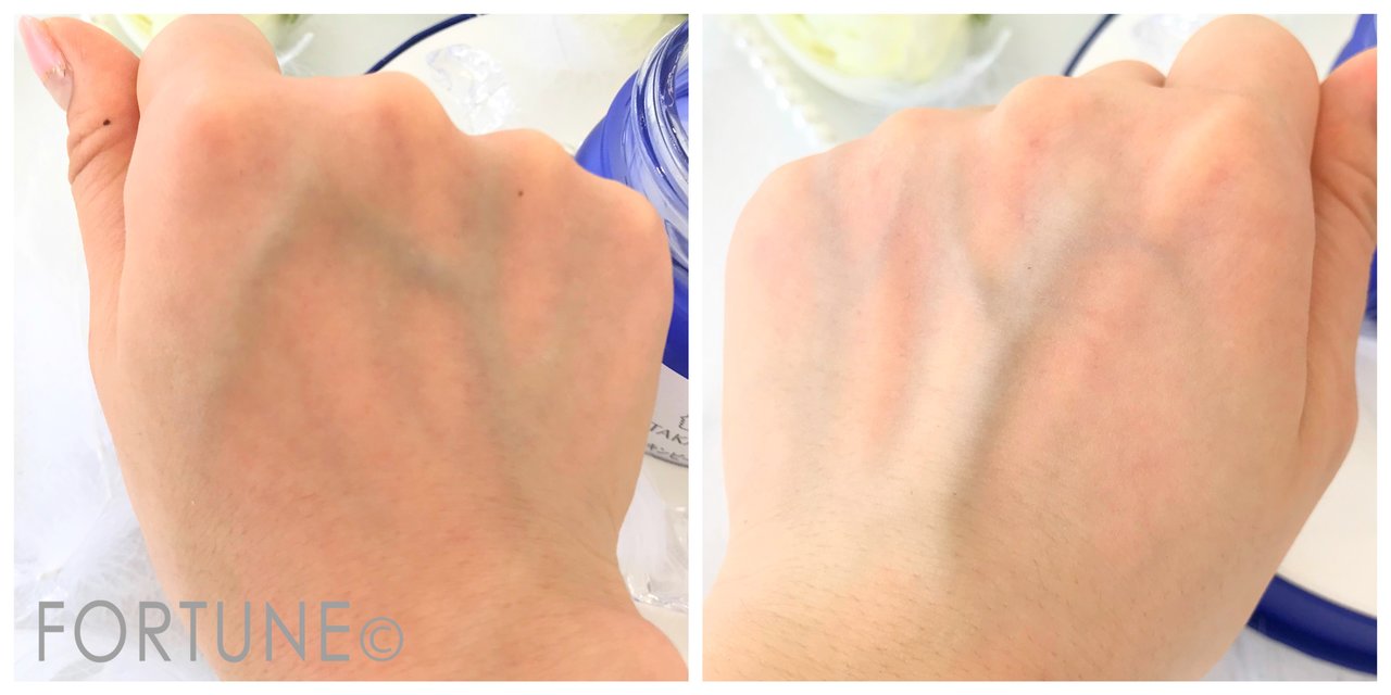 左が何もつけていない手、右が「タカミスキンピールボディ」を塗布した後の手です。