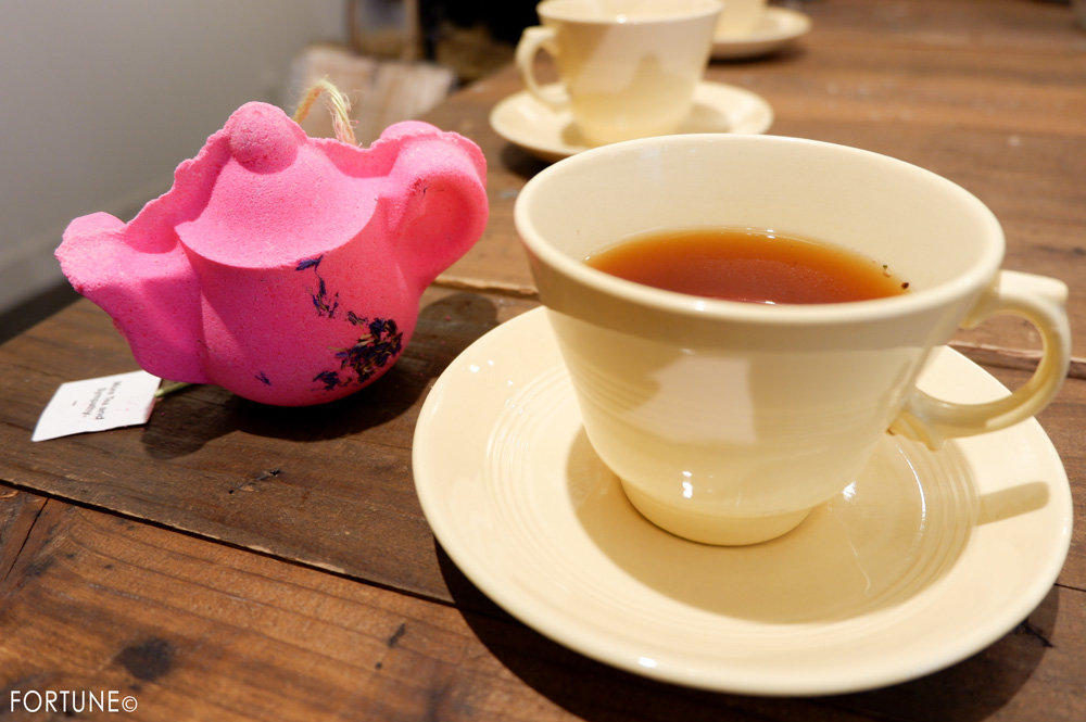 ティーポットの形をした鮮やかなピンクのバスボム。なんと、バスボムの中にアールグレイのティーバッグが入っており、泡と共にベルガモット・ネロリの豊かな香りが広がります。