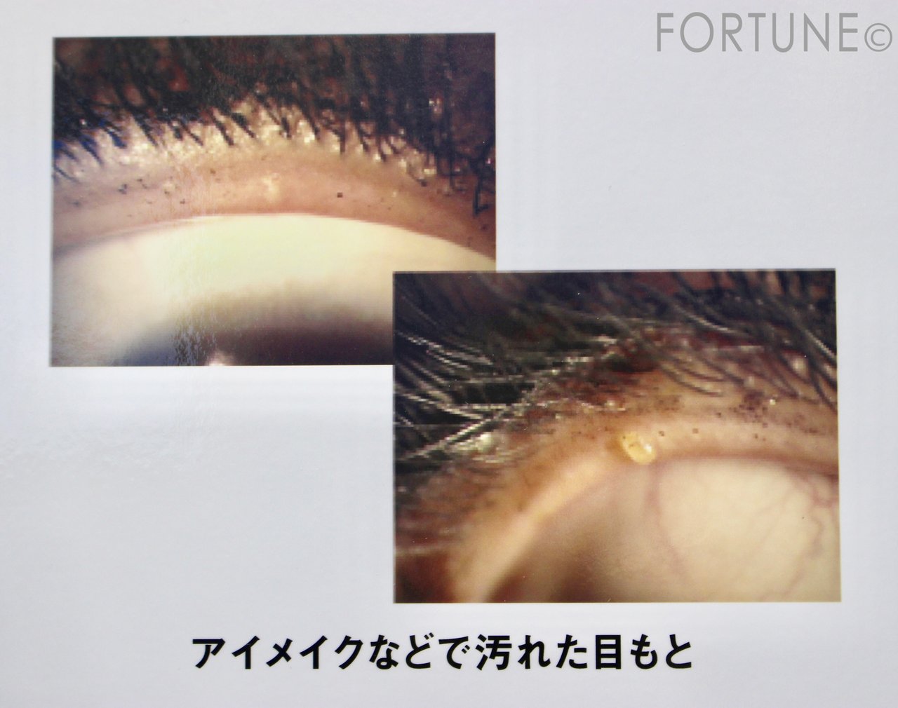 アイメイクだけでなく、アイメイク落としに含まれる油分などで目もとの皮脂腺(マイボーム腺)が詰まっていたとのこと。目もとの表面上の汚れはわかりやすいですが、まつげのキワまで意識している方は少ないのではないでしょうか?