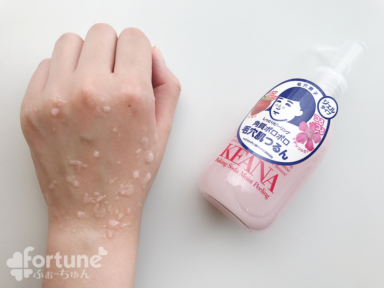 香りなどはなくとってもみずみずしいジェルで、優しく肌を撫でると他のピーリングと比べると柔らかめのポロポロが出てきます。