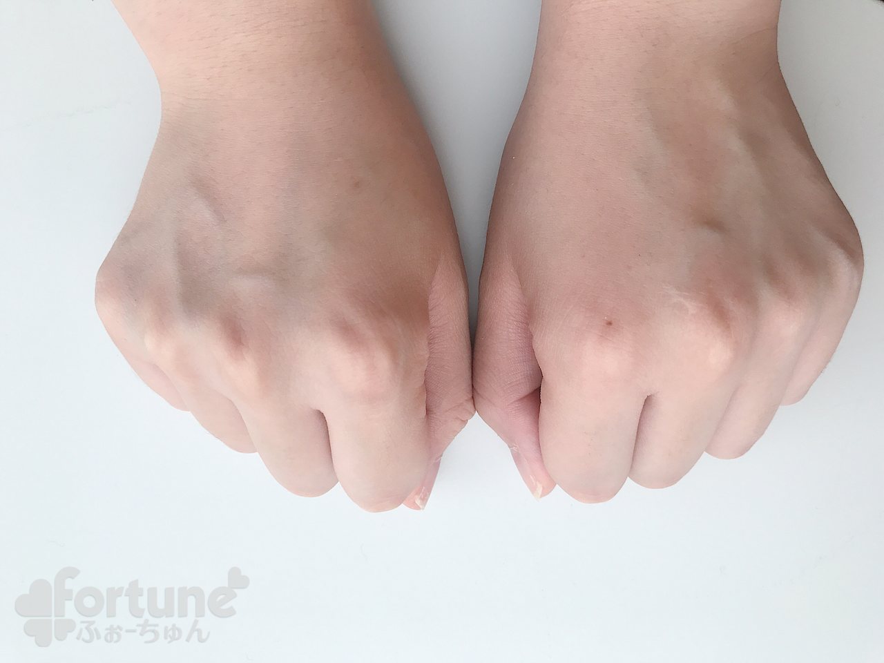 画面に向かって右手が使用後です。毛穴が目立ちにくくなり、白さが増しました。