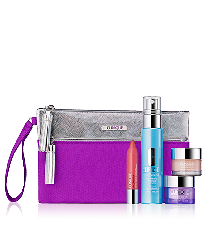 「ターンアラウンド セラム AR」(50mL/8,100円・税込)に加えて、ギフトサイズのクレンジング「テイク ザ デイ オフ クレンジング バーム」、保湿ジェル「モイスチャー サージ EX」、リップ「チャビー スティック モイスチャライジング リップ カラー バーム #13 マイティ ミモザ」と、オリジナルのポーチまでついて8,640円(税込)となっています。
