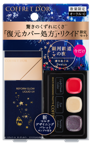 限定デザインをまとった「リフォルムグロウ リクイドUV」と、コレクション限定製品「マルチデザイニングパレット 01」の4色のうち、3色が試せるサンプルがセットになった《コフレドール リフォルムグロウ リクイドUV リミテッドセットb》として発売されます。