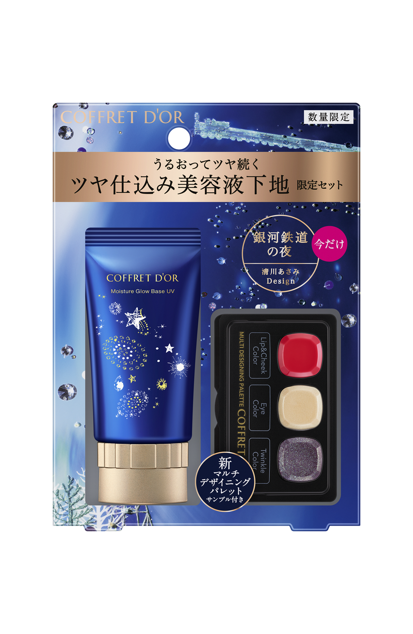 限定デザインをまとった「モイスチャーグロウベースUV」と、コレクション限定製品「マルチデザイニングパレット 01」の4色のうち、3色が試せるサンプルがセットになった《コフレドール モイスチャーグロウベースUV リミテッドセットb》として発売されます。