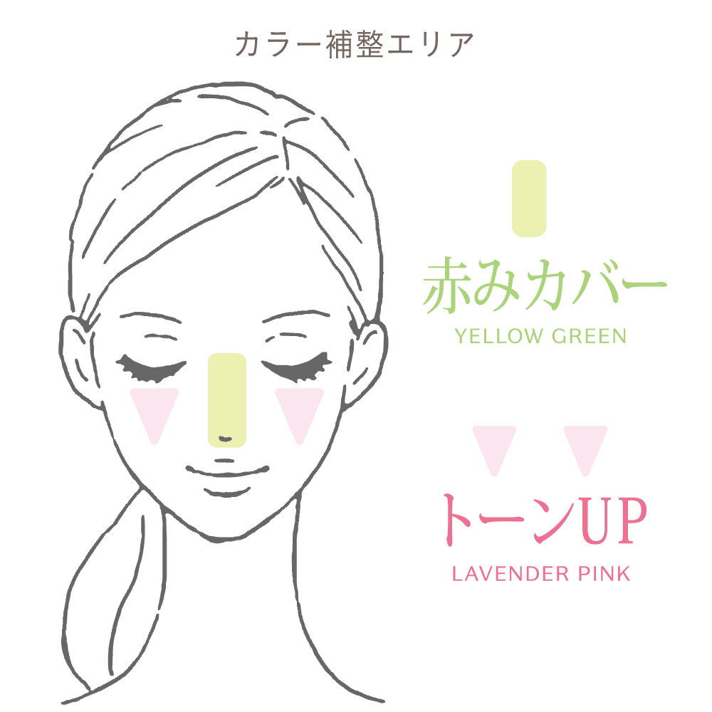 赤みを消すイエローグリーンと、くすみを飛ばすラベンダーピンクによるコントロールカラー兼コンシーラー。