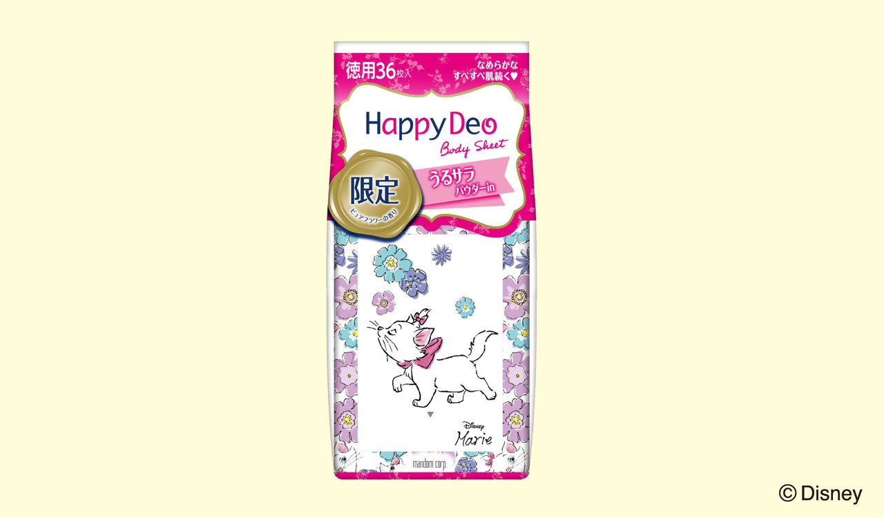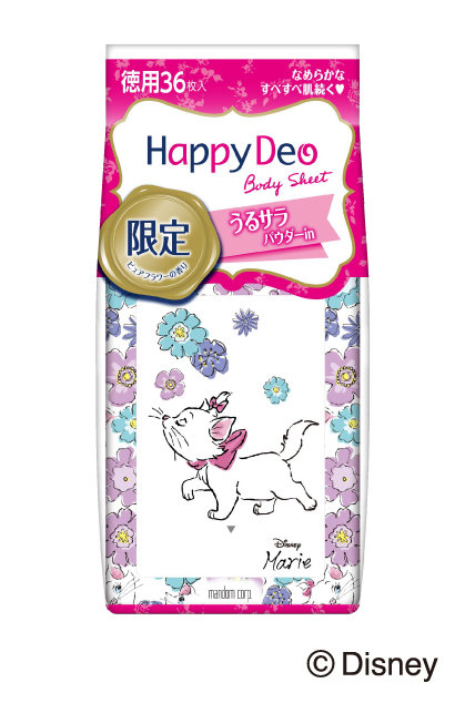 マンダムのハッピーデオシリーズより、ディズニー映画「おしゃれキャット」に登場する“マリー”をデザインした《ハッピーデオ ボディシート うるサラ ピュアフラワー》が仲間入り。