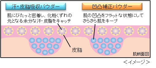 肌に密着してテカリ・化粧くずれを防ぎ、さらに汗・皮脂にも強く、心地いいさらさら肌を長時間キープしてくれます。