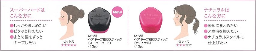 既に発売されている《いち髪 スティック》をナチュラルとし、今回新発売される《いち髪 ヘアキープ和草スティック》はスーパーハード処方で登場です。