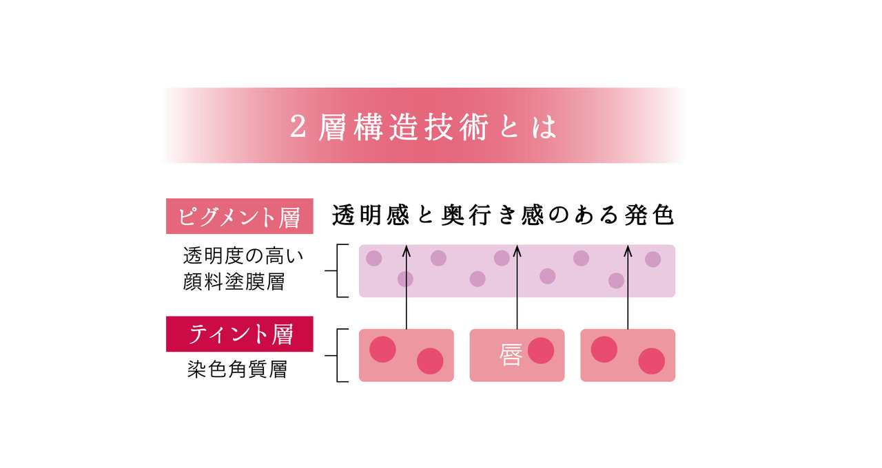 ティント層とピグメント層の2層構造採用により、唇の上ではティント層がパッと発色。