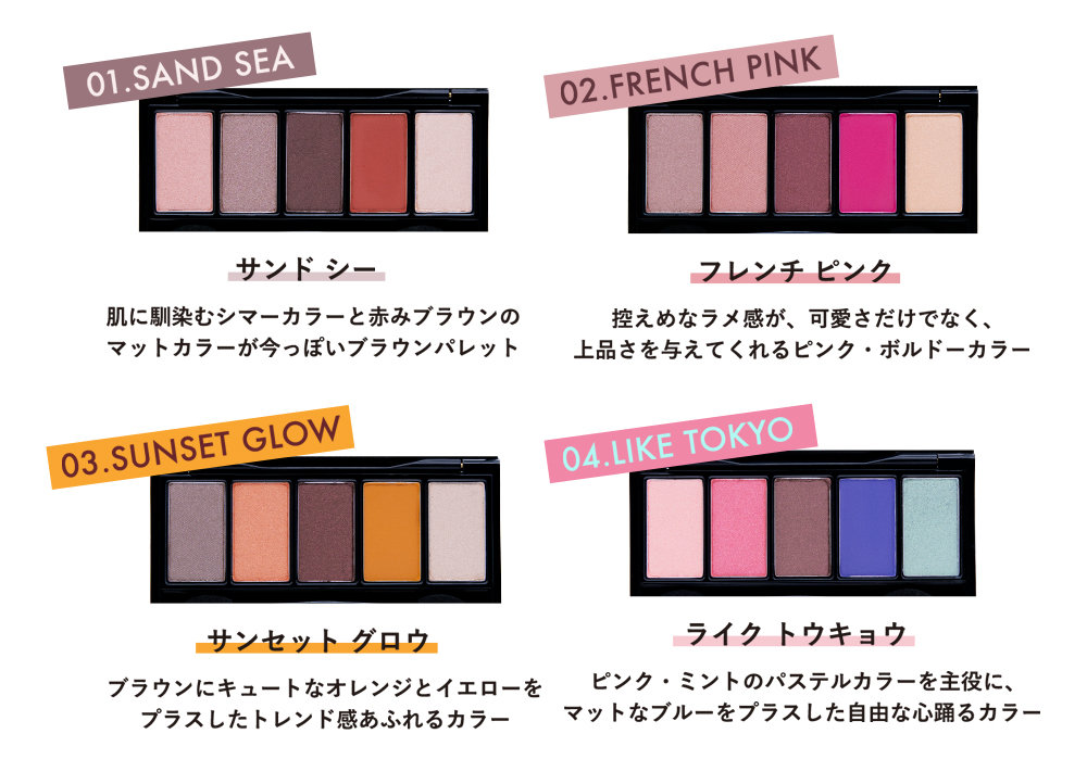 それぞれの色の個性が輝く5色は、シマーな質感が4色と、マットな質感の1色がセットされています。