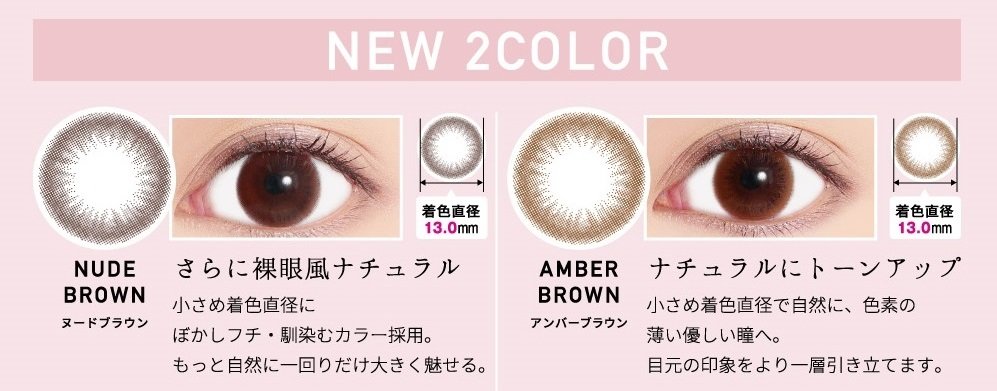 今回登場する新色2カラーは、これまでのカラーコンタクトよりもさらにナチュラルに仕上げてくれる〈NUDE BROWN(ヌードブラウン)〉と、瞳をトーンアップして抜け感を与えてくれる〈AMBER BROWN(アンバーブラウン)〉です。