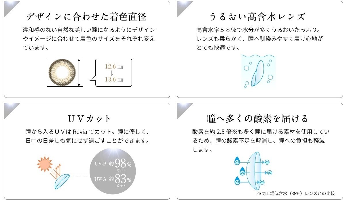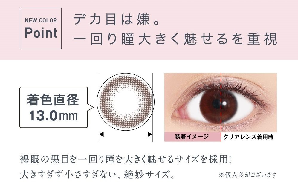 新色2カラーはより大人女子の瞳を自然に愛らしくアップデートするために、既存のReVIA CIRCLEレンズの着色直径13.5mmより小さい着色直径13.0mmが採用されました。