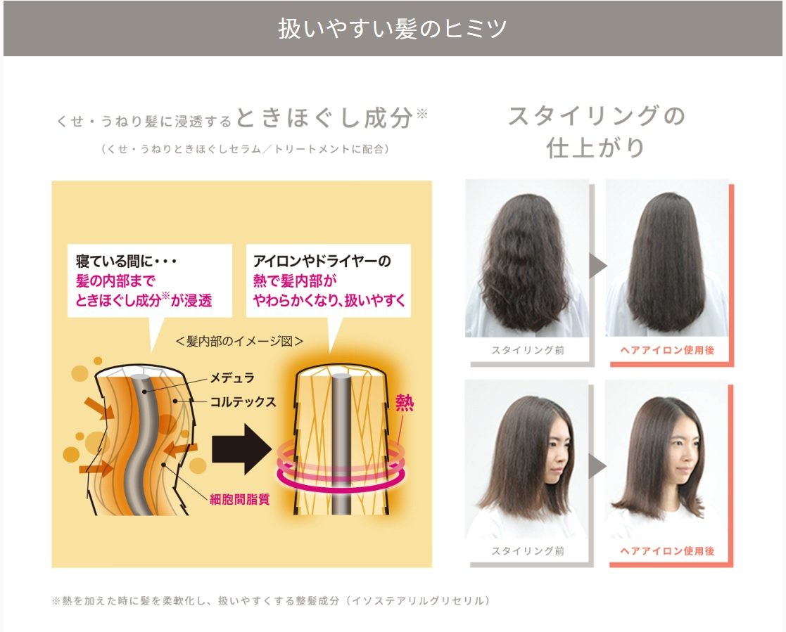 人一倍手間がかかるそんな髪の内部に「ときほぐし成分」が浸透することで、翌朝のアイロンやドライヤーの熱で髪の内部がやわらかくなり、扱いやすい髪へと変わります。