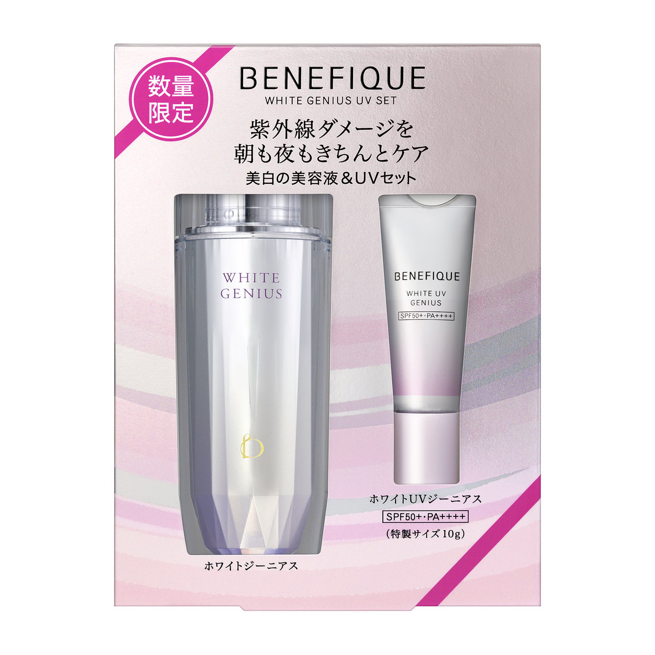 2019年2月21日(木)の発売を先駆け、2019年1月21日(月)には10gの特製サイズとなった《ベネフィーク ホワイトUVジーニアス》と薬用美白美容液「ベネフィーク ホワイトジーニアス(医薬部外品)」の限定セットが数量限定で発売されます。