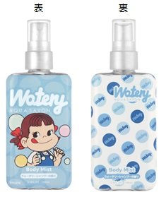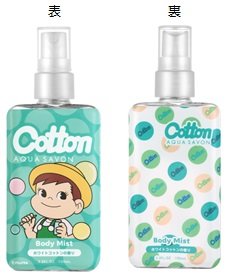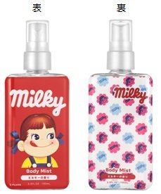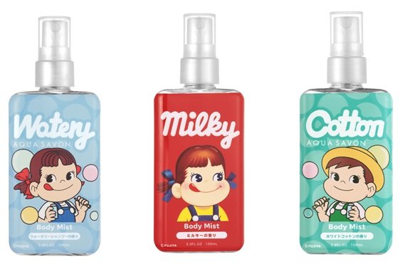 お馴染みのペコちゃんが描かれた定番キャンディ「ミルキー」の香りが再現されたボディミストと、アクア シャボンの2種の人気の香りもペコちゃん&ポコちゃんデザインで登場します。