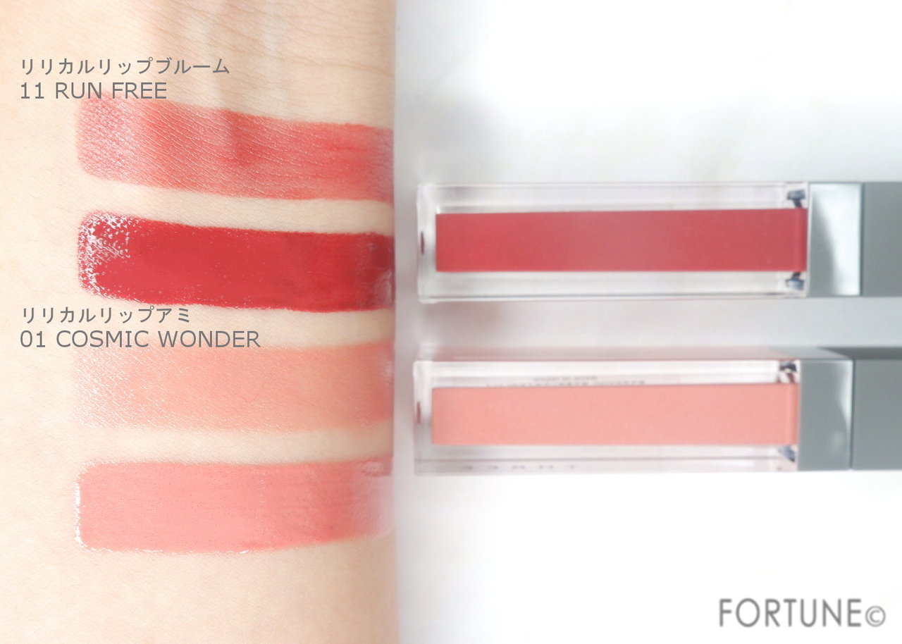 写真上は、「リリカルリップアミ」01 COSMIC WONDERを薄く塗った上から、「リリカルリップブルーム」11 RUN FREEを重ねました。