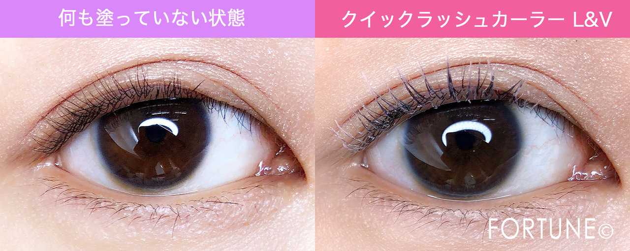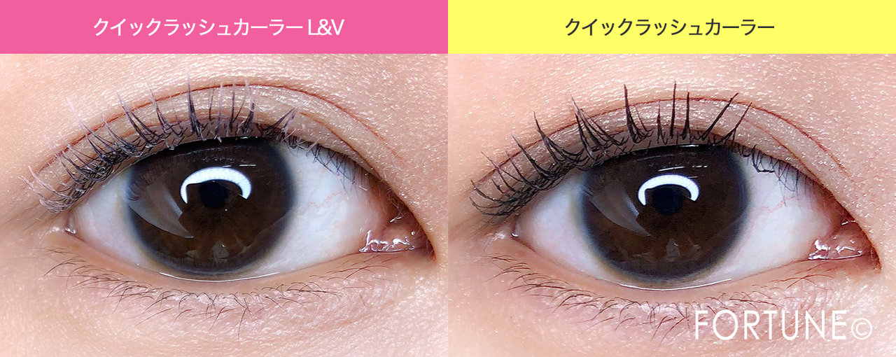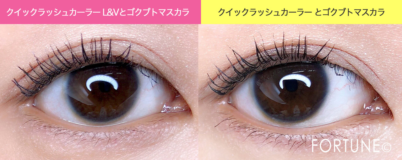 「クイックラッシュカーラー L&V」と「クイックラッシュカーラー(透明タイプ)」それぞれの上からゴクブトマスカラを塗った比較です。