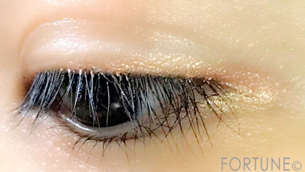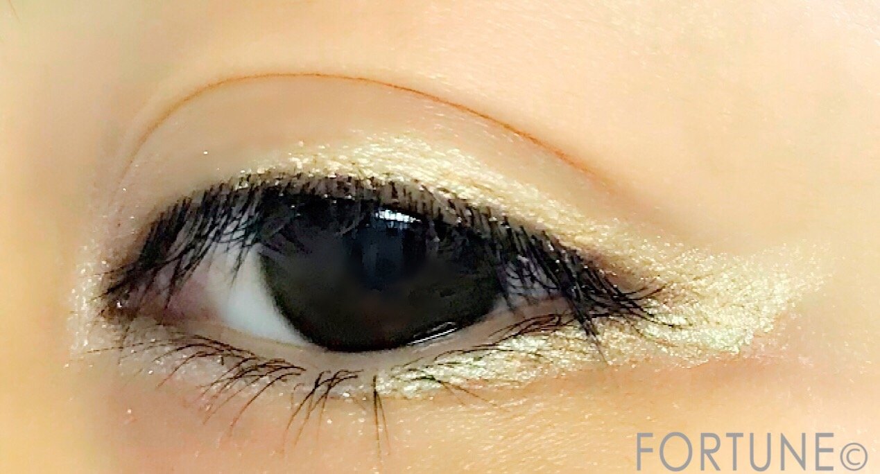 写真は「GD-1 ゴールドライト」を主体にアイラインを目尻のところまで少し跳ね上げるように描きました。
