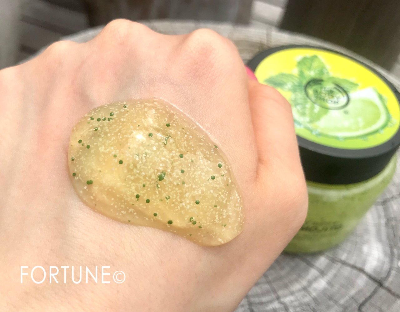 続いてはボディスクラブです。ぷるぷるしたライム色のひんやりしたジェルベースで、ホホバビーズ(スクラブ成分)が配合されています。週に1〜2回の頻度で使用するのがおすすめです。