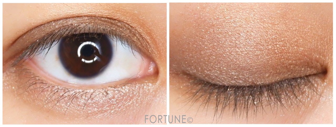 ②のきらめくシャンパンゴールドと③のシマーなブロンズオレンジで、華やかで高級感のある目元を演出します。黒目の上にのせた②で、まばたきするたび印象的なまなざしに。