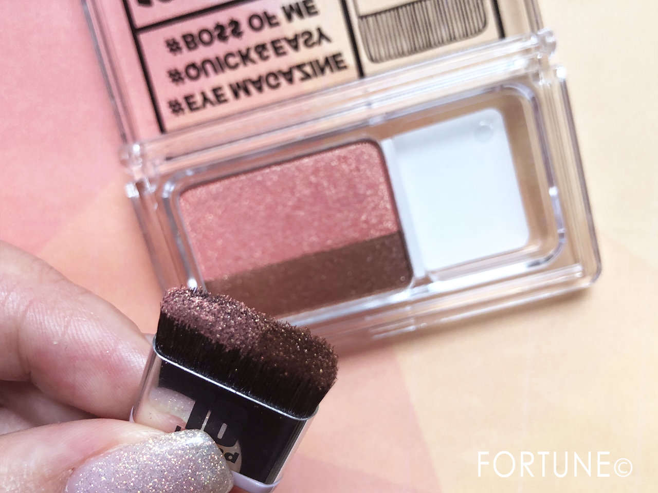 使い方は、ちょうどアイシャドウと同じぐらいの横幅が広いブラシ「クイックメイクアップブラシ」を横にスライドさせてツートンになるようにアイシャドウをつけ、まぶたにそのまま滑らせるだけ!簡単に綺麗なグラデーションが完成します!