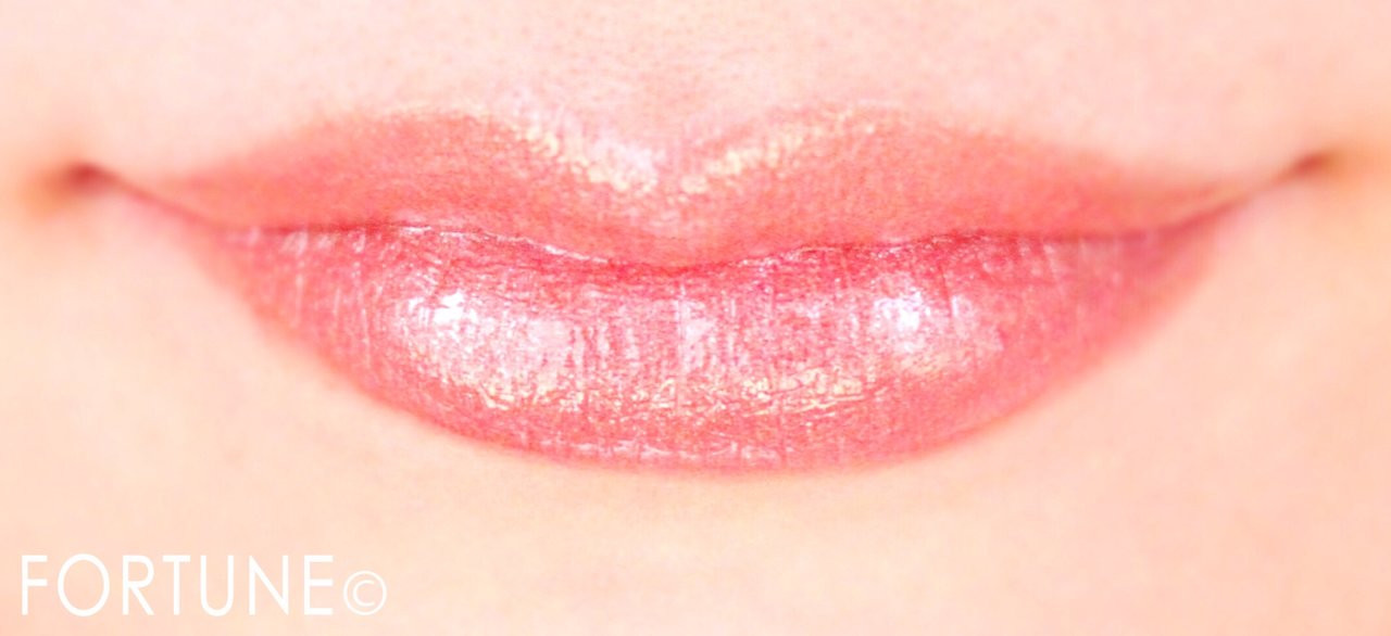 かなりしっかりとラメ感があります。全体に塗ると華やかな印象の唇に!唇の中央に入れ、ハイライトとして使用するのもオススメです。