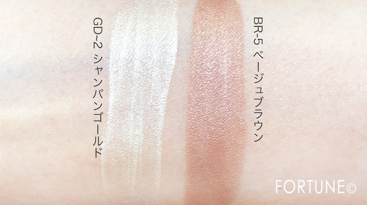 ファシオ リキッドアイカラー WP 濃密発色タイプの「GD-2 シャンパンゴールド」と「BR-5 ベージュブラウン」のスウォッチがこちら。