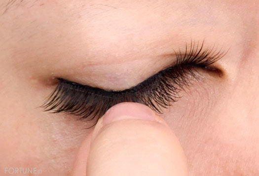 5)まつ毛の生え際は避けて、グルーを塗ったつけまつ毛を接着していきます。