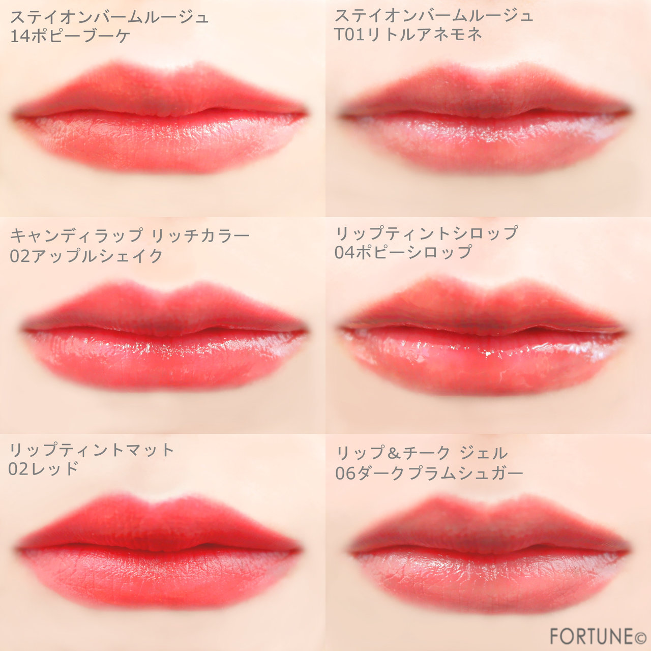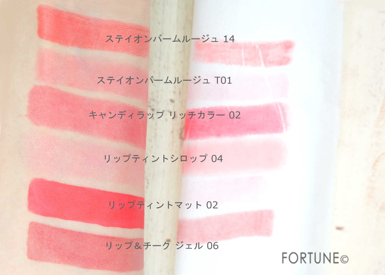 「ステイオンバームルージュ」14、「ステイオンバームルージュ」T01、「リップ&チーク ジェル」06は、ツヤ感はなくなりますが、色持ちは◎
