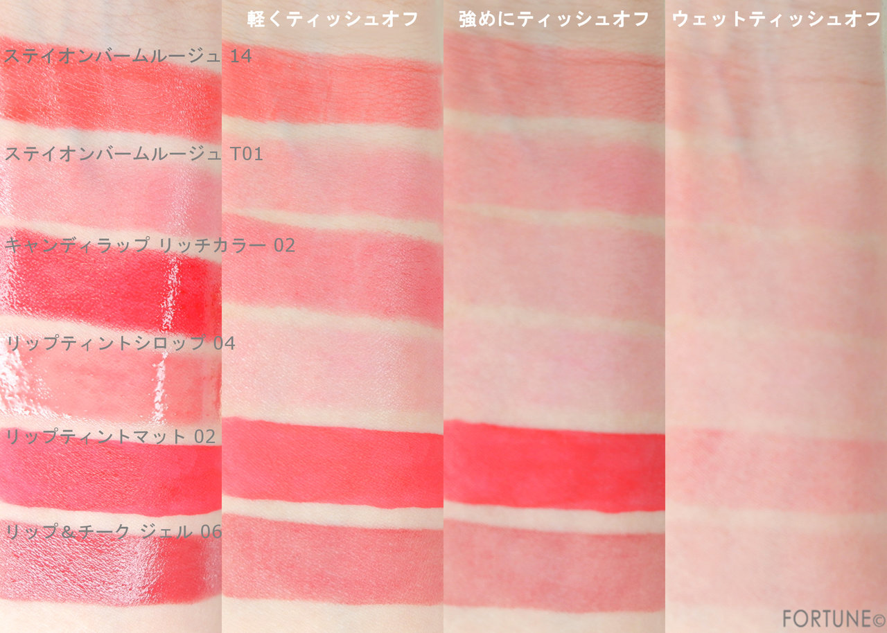 強めのティッシュオフの状態(写真右から2番目)では、「リップティントマット」02が圧倒的な色持ち!