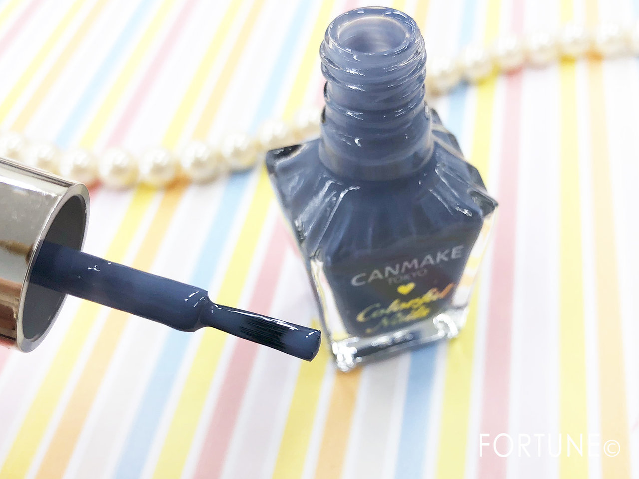 キャンメイクのカラフルネイルズの筆は、塗りやすい平筆タイプでコシのある黒い刷毛が扇状に広がり簡単に綺麗にムラなく塗る事ができます。利き手の爪も綺麗に仕上がる!!速乾タイプなので時間がない時でも使えてセルフネイル初心者さんにもオススメ!