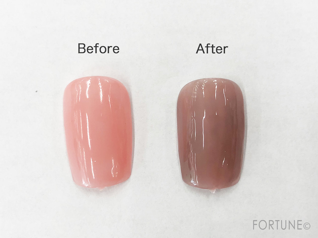 少し透明感のある明るいピンクのネイルカラーにブラックトップコートを重ねると、透明感のあるくすみピンクにチェンジ!
