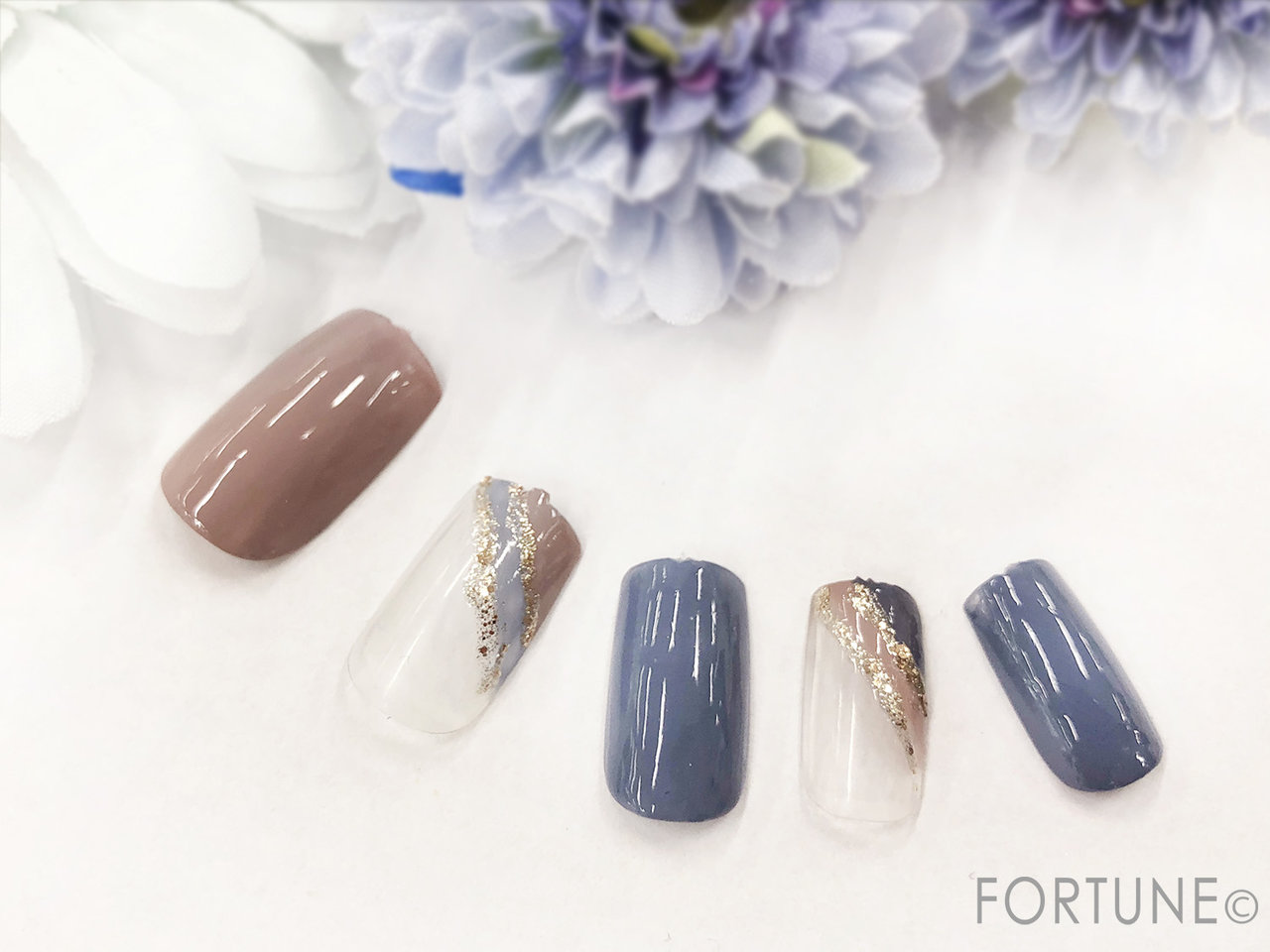 涼しげな寒色コンビのデザイン。ベタぬりと斜めダブルフレンチで簡単に可愛くできます。ダブルフレンチには、ラメ入りマニキュアでラインを入れるとキラキラで可愛い!
