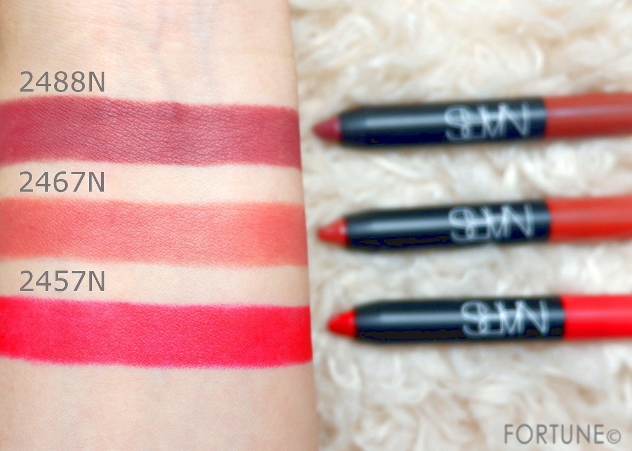 NARS「ベルベットマットリップペンシルトリオ」のスウォッチです。