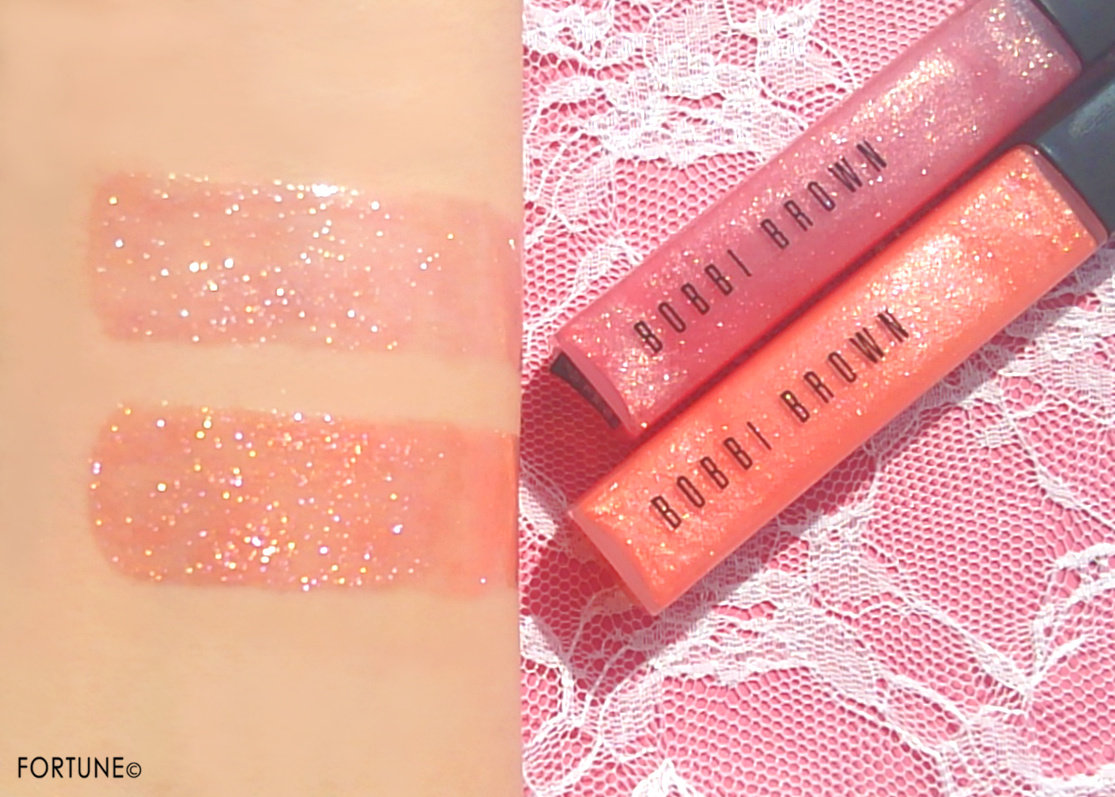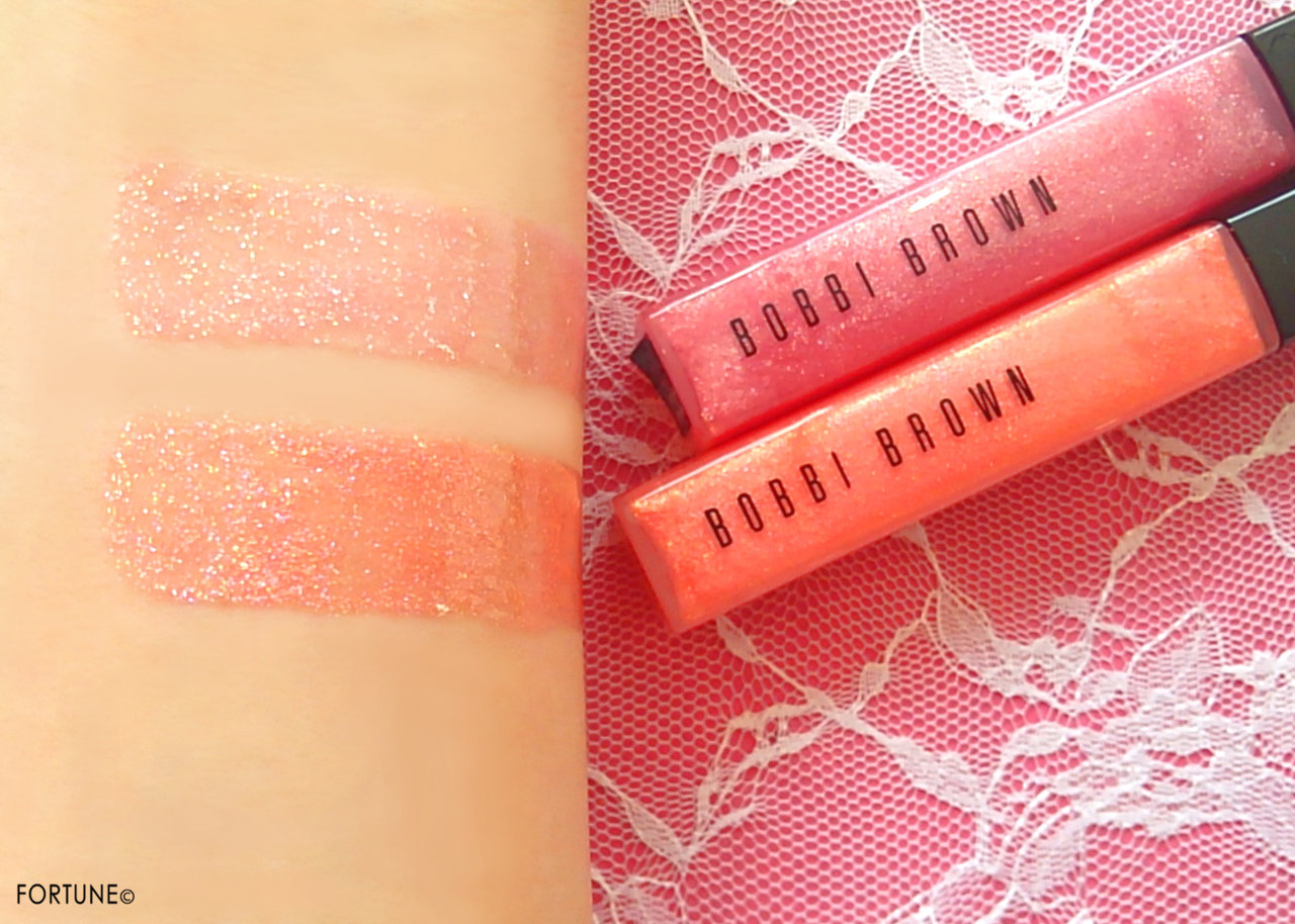 ボビイ ブラウン「ハイシマーリップグロス」の「02ピンクチュール」と「04シトラス」、2色のスウォッチをチェックしましょう。