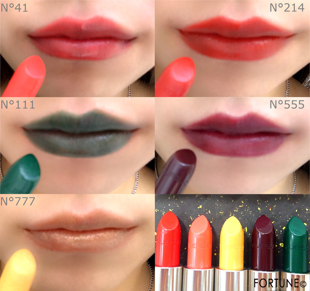 ユニークカラーのN°111のグリーン、N°555の深色ブラウン、N°777のイエローラメ。