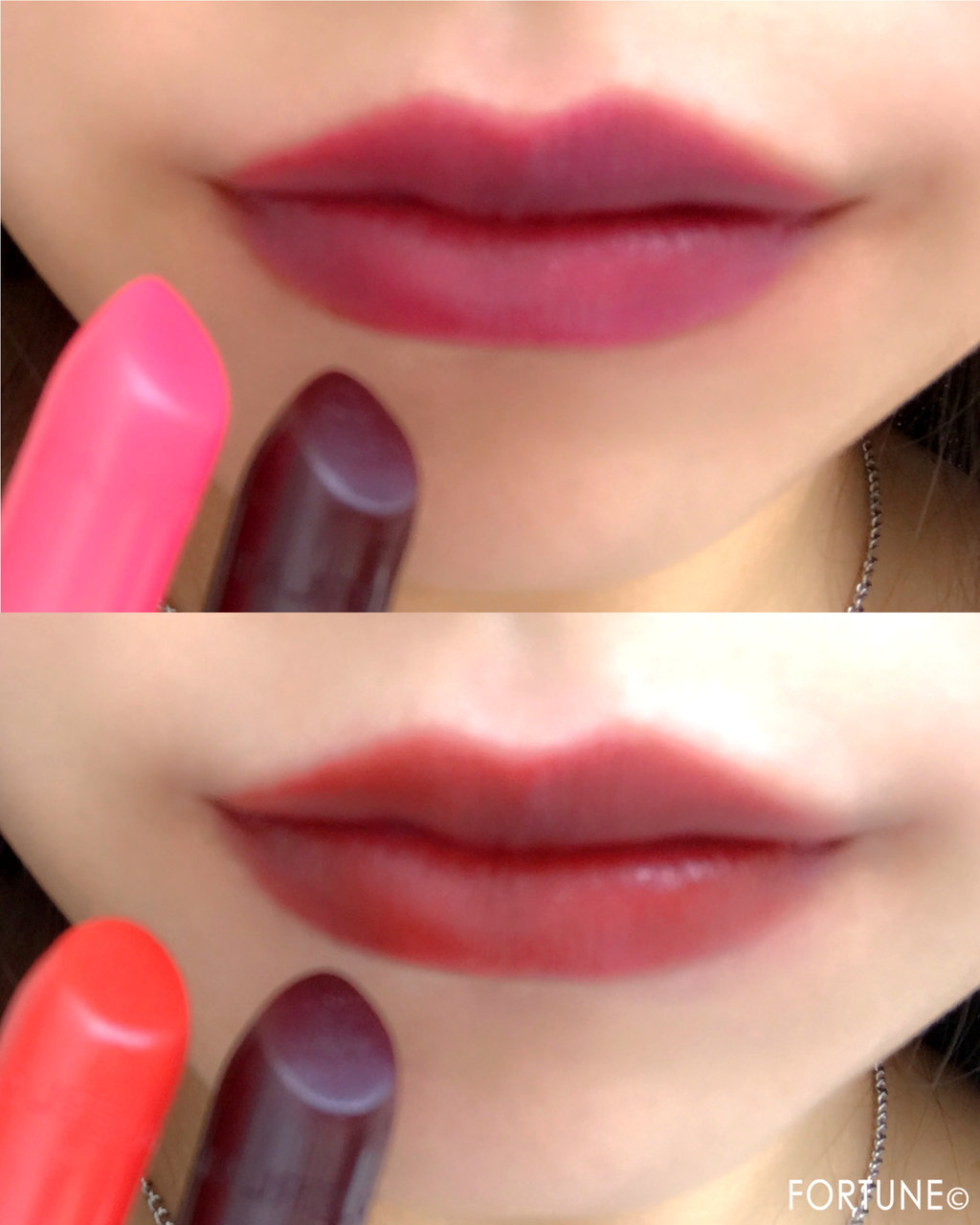 (写真上)唇にポンポンと軽くN°111を乗せた後にN°73を重ねるとパープルに。