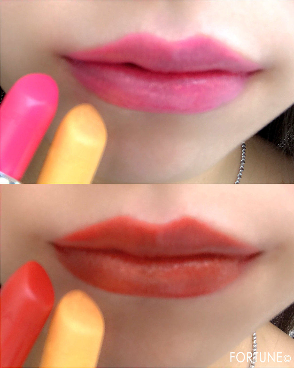 (写真上)薄めにN°555を唇に伸ばし、上からN°73を乗せると上品な深みピンクに。