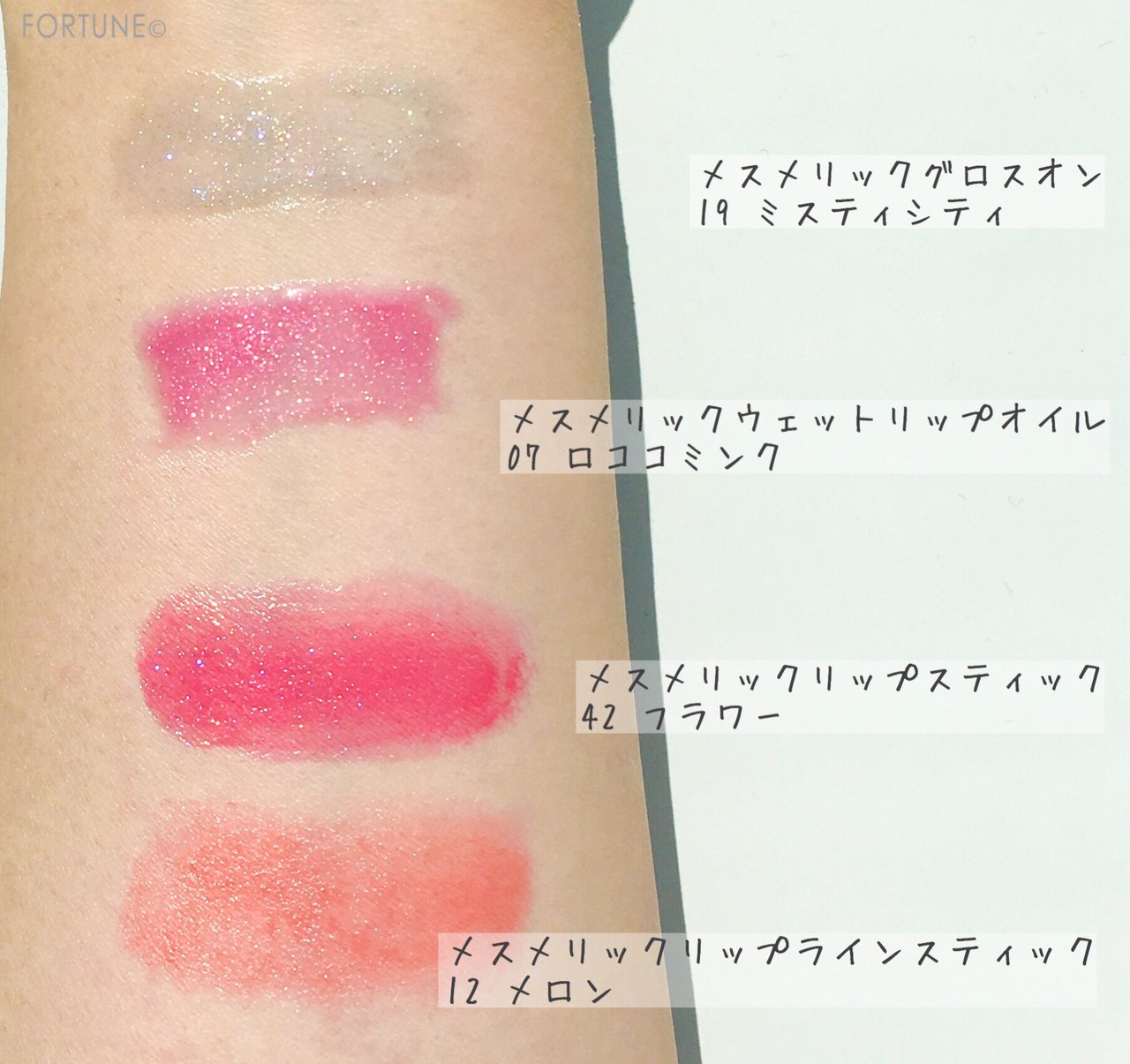 「メスメリック グロスオン 19 ミスティシティ」と「メスメリック ウェットリップオイル 07 ロココミンク」