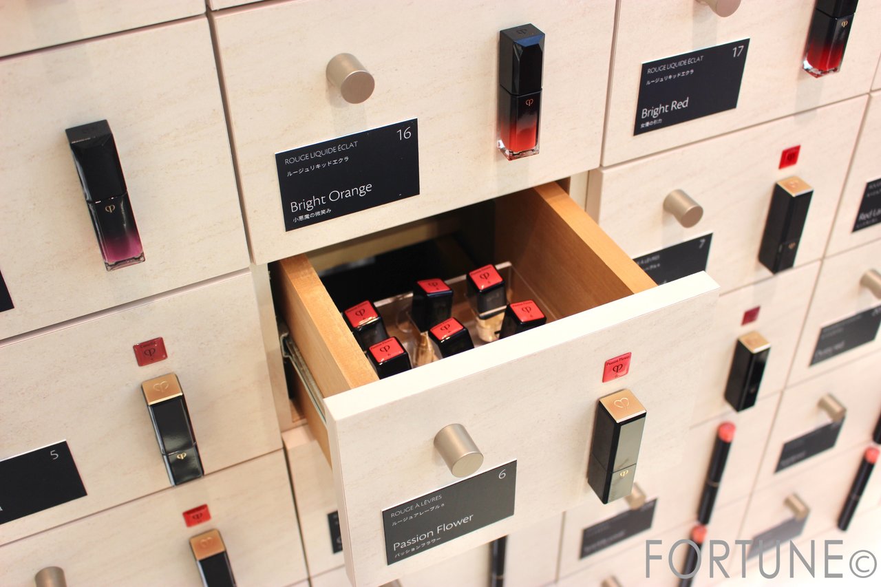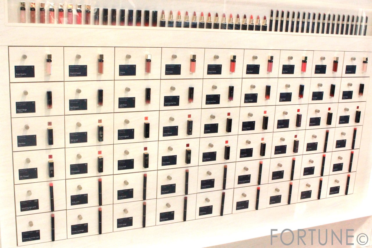こちらが「リップワードローブ」壁一面にクレ・ド・ポー ボーテのリップがびっしり!