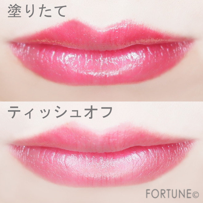 「ドラマティックルージュP」は、まるでリップクリームのようにしっとりウルウルになれるルージュなので、ティッシュオフしても唇のうるおいはしっかりキープしてくれますよ!