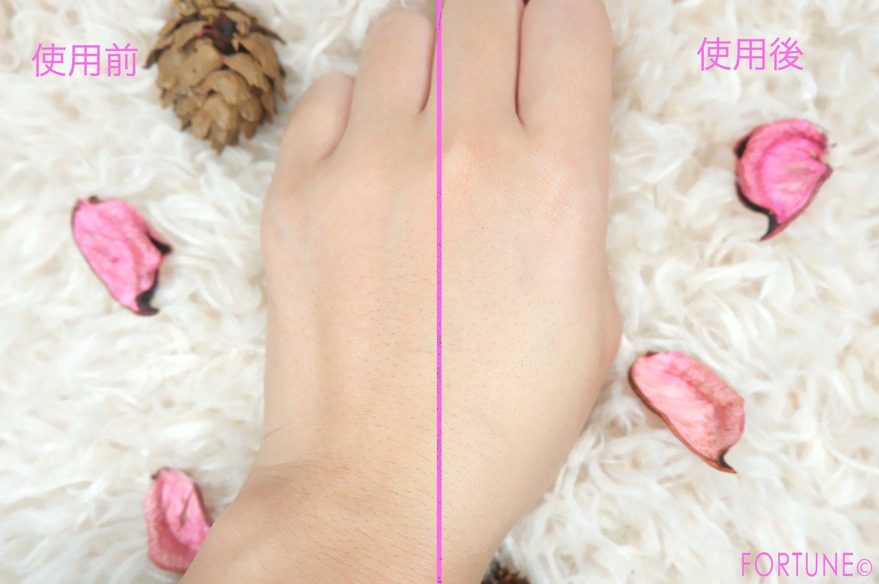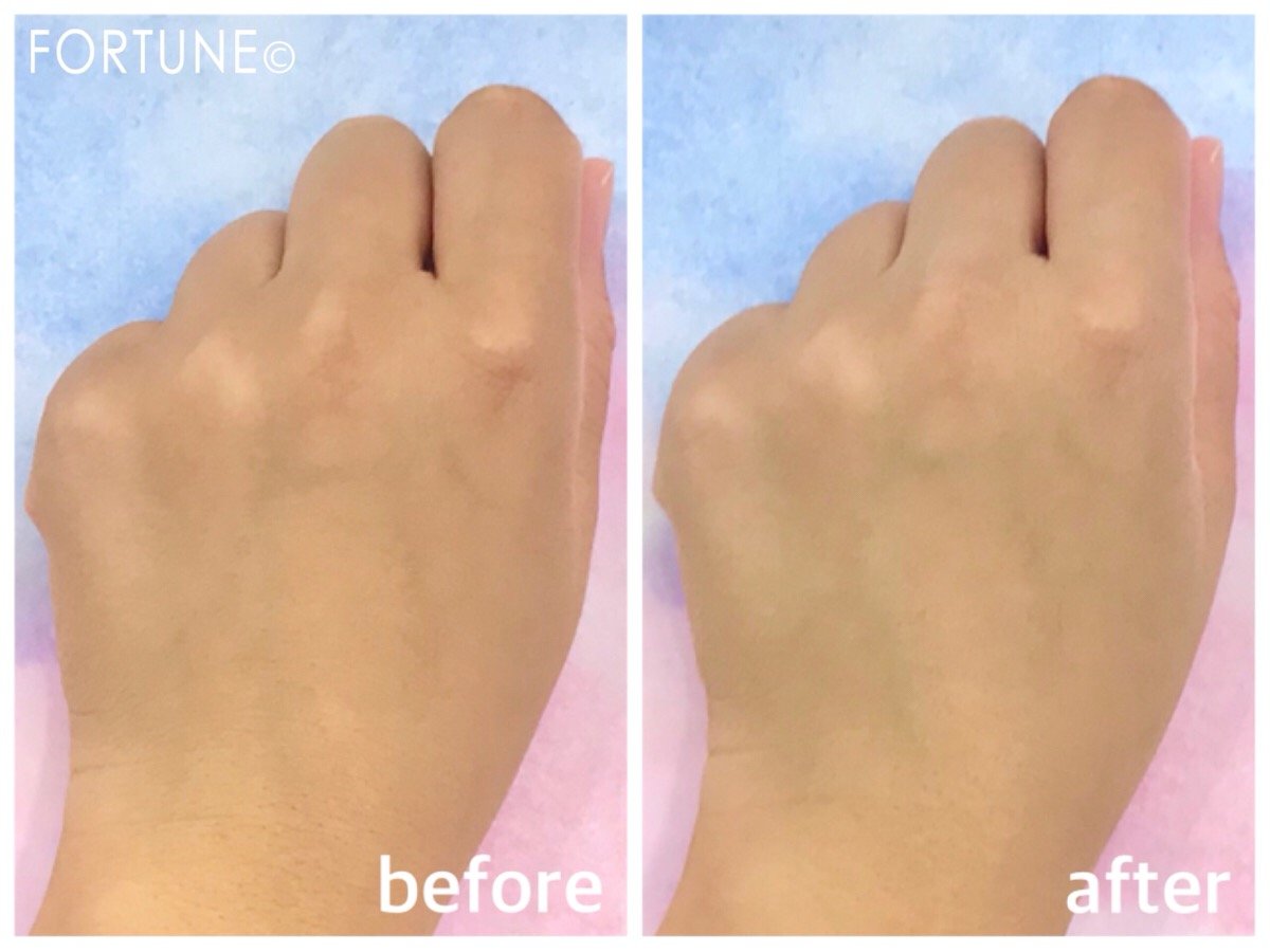 写真を見てもらえればわかりやすいと思いますが、手の甲に浮き出ていた毛細血管を綺麗にカバーして、なめらかで均一な肌色に整えてくれています。