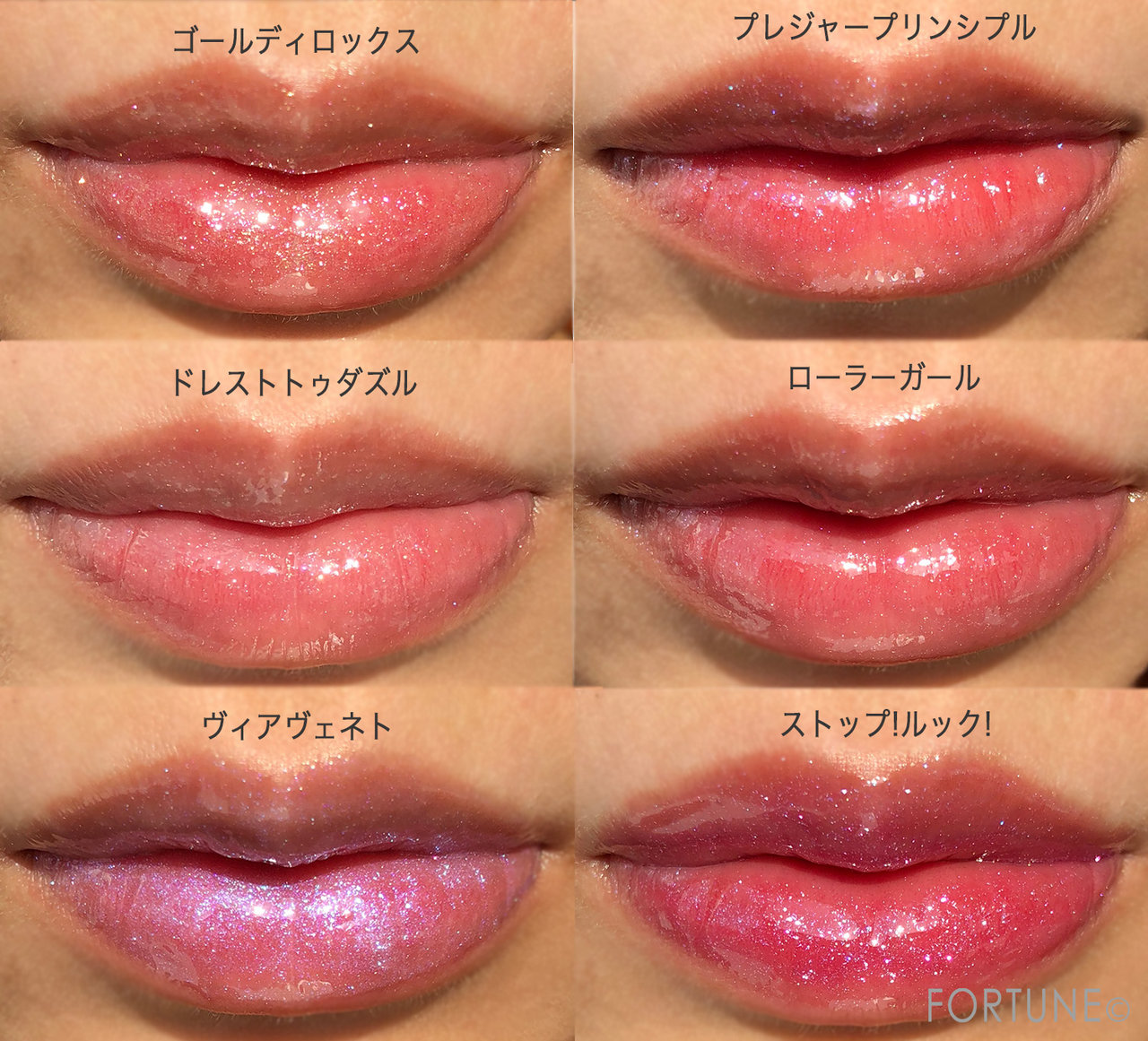 ぶどうの様な、みずみずしい唇になれる「ストップ!ルック! 」は、青みピンクに大粒のピンクラメとブルーラメが入っている濃いめの発色。単体でも十分に使えるカラーです。ゴールディロックスとプレジャープリンシプル は手持ちの口紅に重ねてニュアンスが楽しめるカラーになっています。